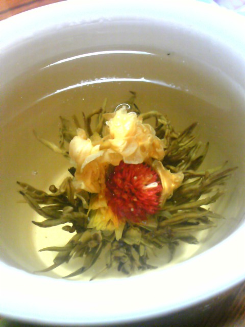 開いた茶葉の中の花と花輪が綺麗です。